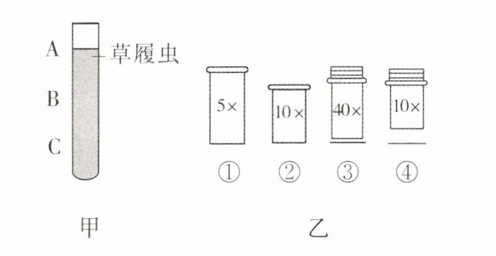 (3)草履虫的细胞较大,几乎肉眼可见。图乙所示是目镜和物镜及观察到清晰物像时物镜与装片间的距离,为较好地观察草履虫完整的运动轨迹,其中最为合适的组合是____(填序号)。