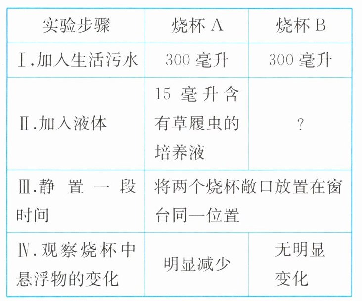 (2)①探究草履虫是否可以净化污水 ②15 毫升不含草履虫的培养液 对照 ③控制单一变量,避免其他因素的干扰 ④草履虫可以净化污水