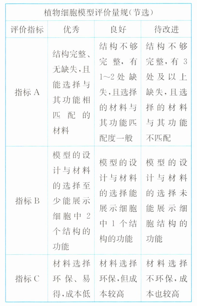 2. 某班同学为当地的科普馆制作细胞模型。同学们在老师的带领下,分小组进行项目规划,并开启了项目学习的探究实践之旅,制作细胞模型并对其科学性设计了如下评价量规。请运用所学知识,对同学们利用彩色橡皮泥等材料制作的植物细胞模型进行评价。