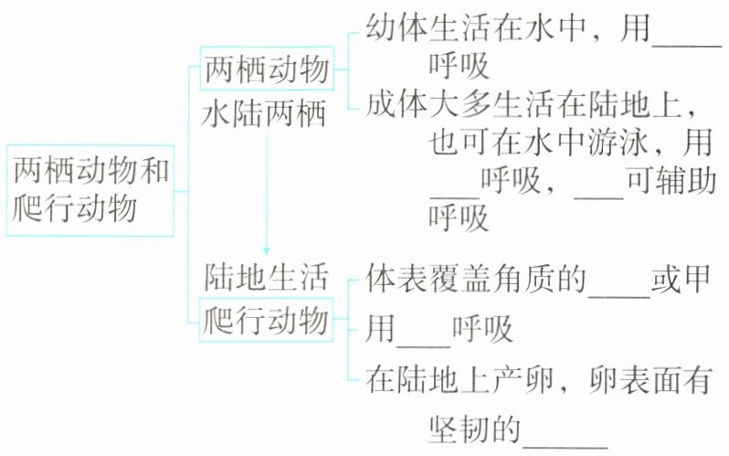 )①体表覆盖角质的鳞片 ②体表裸露 ③在陆地上产卵 ④水陆两栖 ⑤皮肤可辅助呼吸 ⑥卵表面有坚韧的卵壳