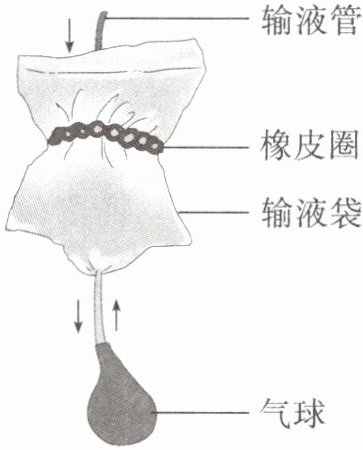 14. (建构模型)学习了有关鸟呼吸方式的知识后,某校生物社团的成员利用输液袋与输液管、橡皮圈、气球等制作了一个鸟的呼吸系统模型(如下图所示),其中输液管模拟的是气体进出鸟的肺的通道。请据图回答下列问题。