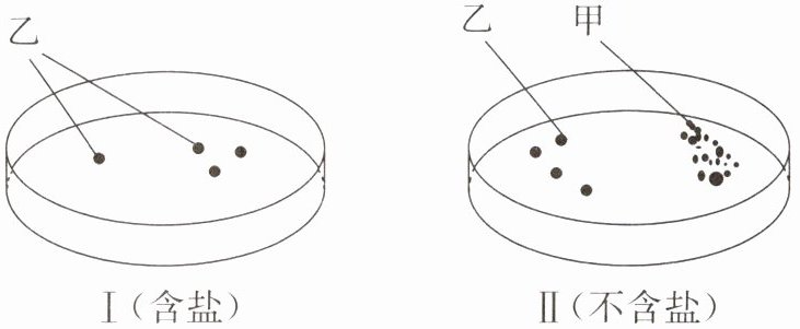 9. 已知Ⅰ培养基含盐,Ⅱ培养基不含盐。在Ⅰ、Ⅱ培养基上都接种甲、乙两种细菌,培养几天后结果如下图所示,Ⅰ培养基上只有乙细菌的菌落,Ⅱ培养基上甲、乙两种细菌的菌落都有。下列有关推测最合理的是(