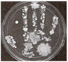 8. 人们常说:“菌从手来,病从口入。”人的手上分布有大量微生物,无菌固体培养基经人手按压,培养一段时间后呈现如图所示的结果。下列相关叙述错误的是(