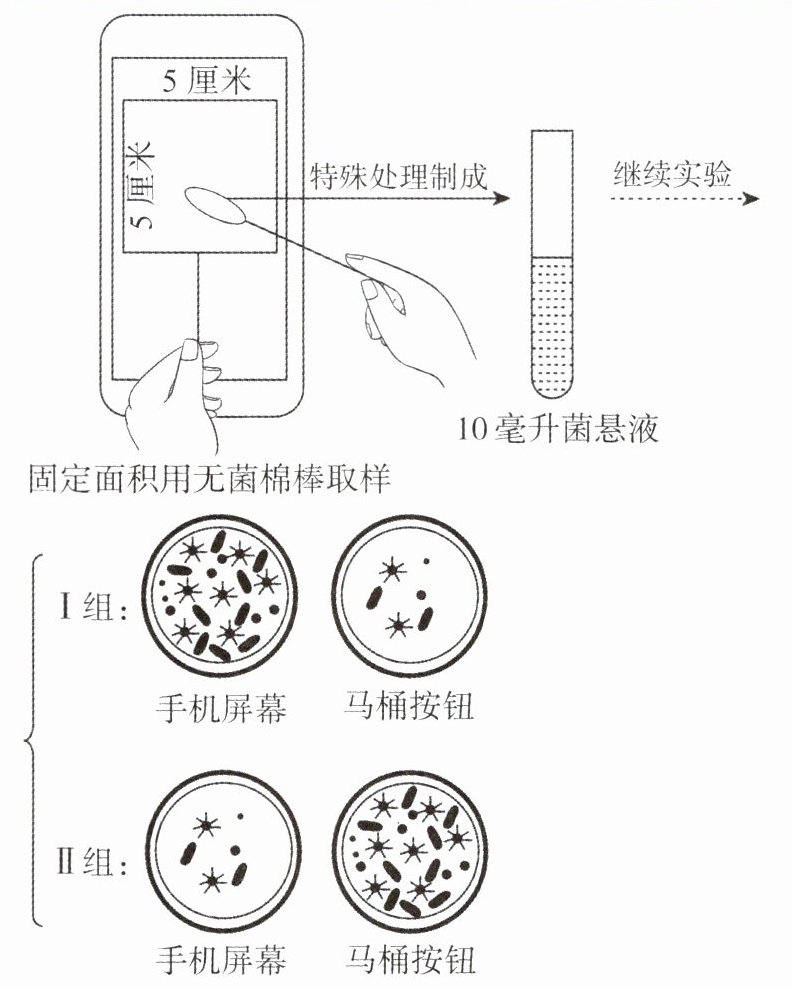 12. (探究实践)在我们的日常生活中,越来越多的人患上“手机依赖症”。由于人的手经常接触手机,手机表面温暖、潮湿,非常适合细菌的生长。为判断“手机屏幕比马桶按钮单位面积上的细菌数量多”的真假,某生物学小组的同学进行了相关实验,部分过程及结果如下图所示。请分析回答下列问题。