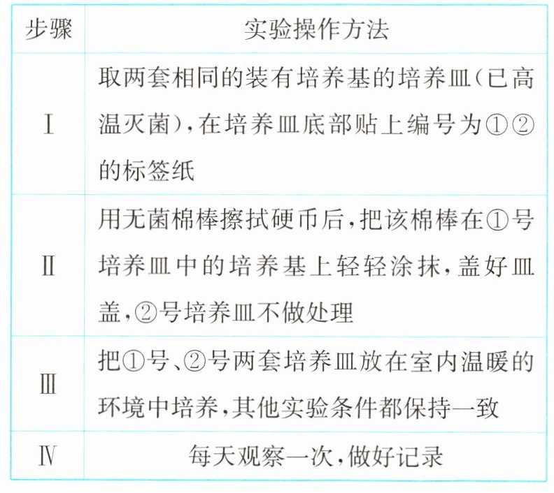 1. 某校七年级甲班同学为了检测硬币上是否有细菌和真菌,设计实验并进行探究,实验步骤如下表,请分析表中信息并回答下列问题。