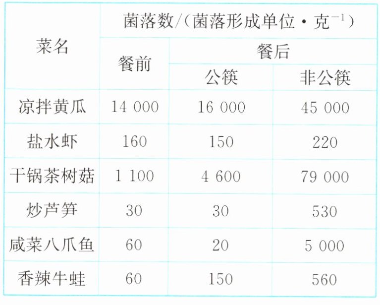 。(4) 分析与表达:分析实验数据,可以发现每一道菜“公筷”组均比“非公筷”组的菌落数少,证明