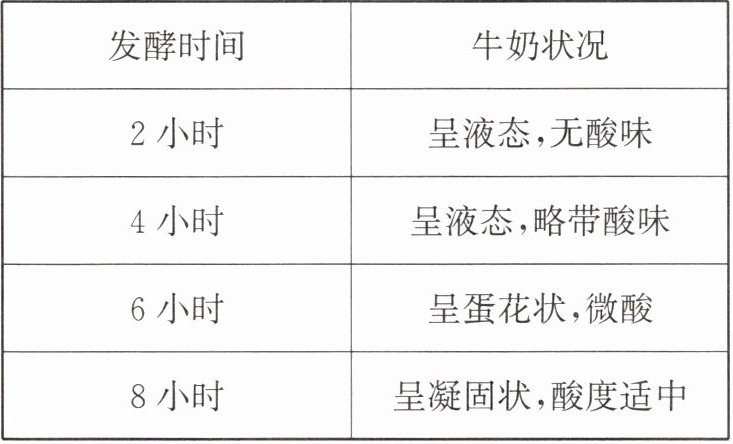 (4)该小组进一步探究了“制作酸奶的发酵时间”,实验结果如上表所示。根据实验结果,得出的结论是制作酸奶的发酵时间以