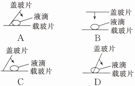 (1) 正确地盖盖玻片是成功制作临时装片的关键。下图所示制作临时装片时最不容易出现气泡的是(箭头代表盖盖玻片的方向)