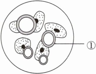 A. 据图可知,刮取的口腔上皮细胞在生理盐水中是均匀涂抹的B. 图中口腔上皮细胞不清楚,可能是盖盖玻片操作不当引起的C. 视野中的①是细胞核D. 视野中光线过强应调节反光镜和光圈答案:C解析:视野中的①有规则的边缘,内部空白,没有细胞结构,因此可判断①是气泡。