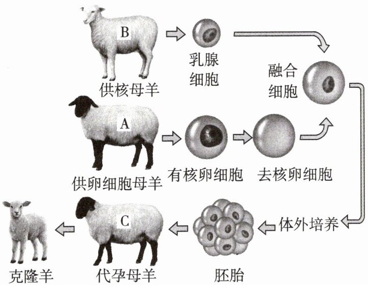 5. 克隆羊多莉的诞生曾引起世界的巨大关注。下图表示小羊多莉的诞生过程,请分析并回答下列问题。