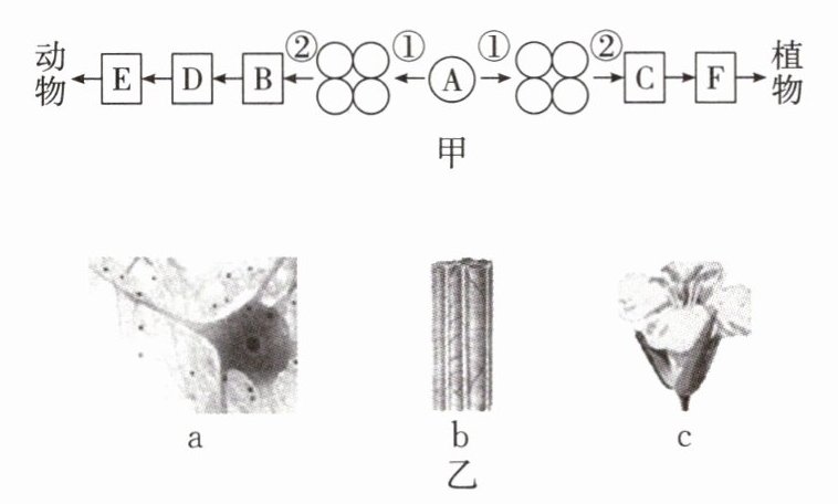 6. 图甲表示动物、植物的结构层次,其中数字代表生理过程,字母代表各自不同的结构层次;图乙表示动物、植物不同部位的组织或器官。请分析并回答问题。