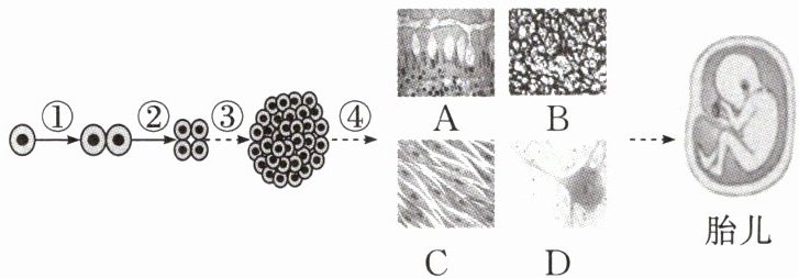 (3)从图中 A、B、C、D 所属结构层次到胎儿,中间还有的结构层次是