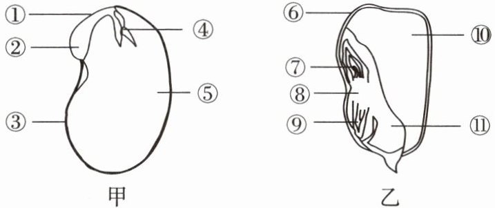 解析:图甲是菜豆种子结构图,菜豆的种子有两片子叶,属于双子叶植物;图乙是玉米种子结构图,玉米属于单子叶植物,其种子中的⑪子叶在种子萌发时起转运营养物质的作用;双子叶植物的子叶储存大量营养物质,因此豆浆的营养物质来自⑤;种子的胚包括胚芽、胚轴、胚根和子叶四部分,图乙中的胚包括⑦⑧⑨⑪。