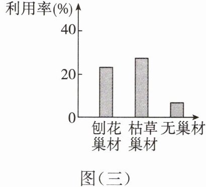 (3)鸳鸯是树栖鸟,搭建人工巢箱可以给它们提供更多的栖息场所。鸳鸯对巢箱中添加的不同巢材的利用情况不同,根据图(三),如果你参与人工筑巢项目,会选择