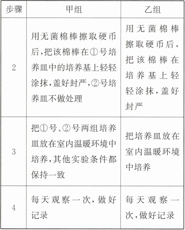 |2|用无菌棉棒擦取硬币后,把该棉棒在①号培养皿中的培养基上轻轻涂抹,盖好封严,②号培养皿不做处理|用无菌棉棒擦取硬币后,把该棉棒在培养基上轻轻涂抹,盖好封严|