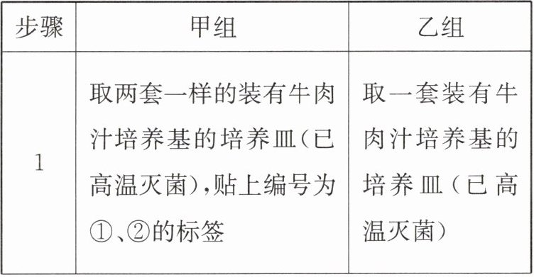 |1|取两套装有牛肉汁培养基的培养皿(已高温灭菌),贴上编号为①、②的标签|取一套装有牛肉汁培养基的培养皿(已高温灭菌)|