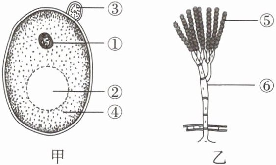 8. 如图是某学生做“观察酵母菌和青霉”实验时绘制的显微镜下观察到的酵母菌(甲)和青霉(乙)的形态结构简图。请你根据所做过的实验和观察到的实验现象,回答下列问题。