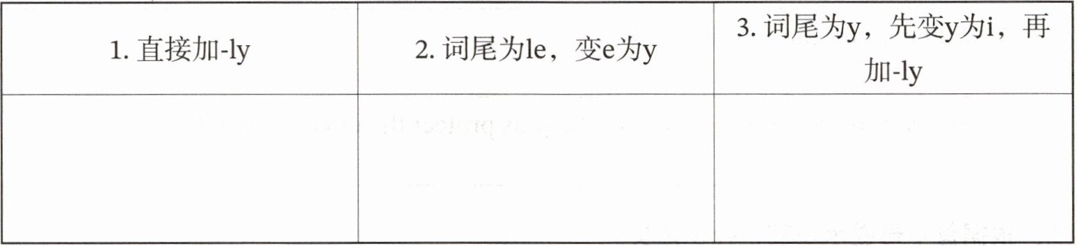 | 1. 直接加 -ly | 2. 词尾为 le,变 e 为 y | 3. 词尾为 y,先变 y 为 i,再加 -ly |
