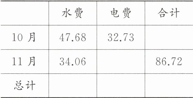 2. 下面是冬冬记录的他家 10 月和 11 月水费和电费情况,请你把表填完整。(单位:元)