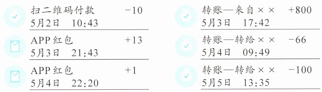 如果正数表示收入,负数表示支出,那么妈妈的手机账单上 5 月份的第一周,是收入多还是支出多?多多少元?
