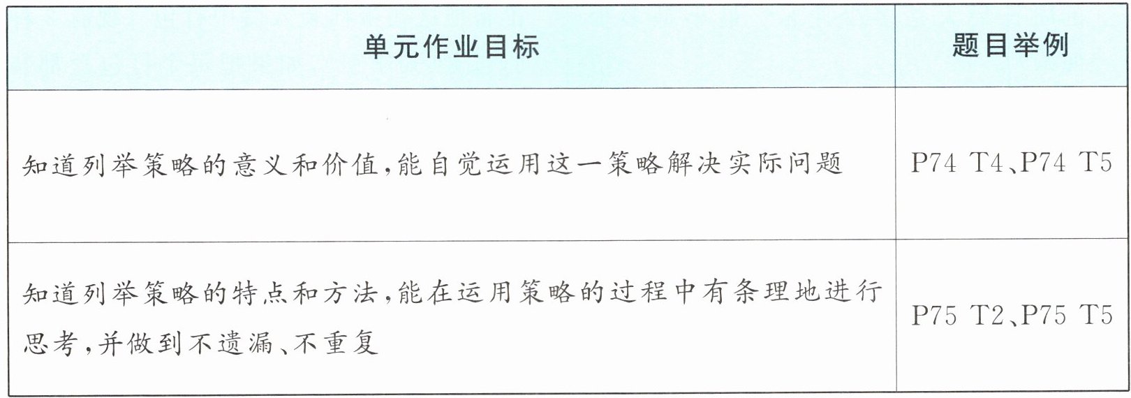 知道列举策略的意义和价值,能自觉运用这一策略解决实际问题 P74T4、P74T5