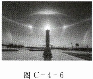 12. 如图C-4-6所示的“幻日”奇观,是由太阳光经过大气中的小冰晶发生了______(选填“反射”或“折射”)形成的。诗人高骈在《山亭夏日》中描述“绿树阴浓夏日长,楼台倒影入池塘”,诗人看到“绿树”是由于它______(选填“反射”或“吸收”)绿光;若透过红色滤光镜(只能透过红光)看绿叶,则看到叶子为______色。