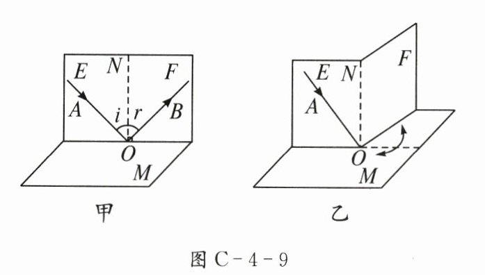 (4)如图C-4-9乙所示,把F绕ON向前或向后翻折,则在F上______(选填“能”或“不能”)看到反射光,这说明反射光线、入射光线和法线在______。