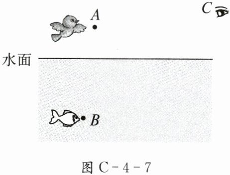 13. (1)如图C-4-7所示,平静水面上方的小鸟和水中的小鱼分别位于A、B位置,在C点的人看到它们在水中的像A’和B’恰好重合。请画出人眼看到小鸟在水中的像和小鱼在水中的像的光路图(保留作图痕迹)。