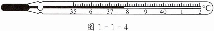 5. 图 1 - 1 - 4 中体温计的示数为______℃。若该体温计没有甩过(但经消毒)就用来给一个体温($36.5℃$)正常的同学量体温,则体温计的示数将______(选填“变大”“变小”或“不变”)。