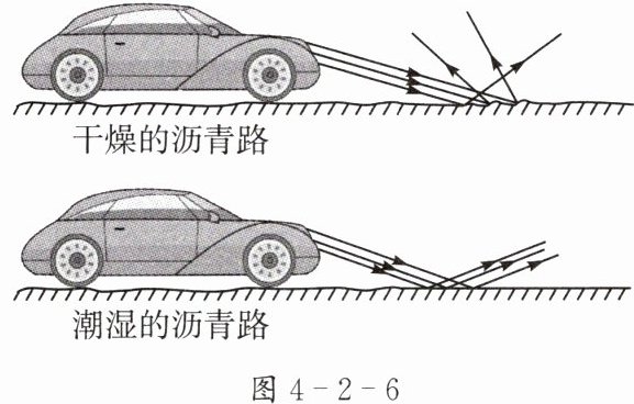 1. 汽车在干燥的沥青路面上和潮湿的沥青路面上行驶时,大灯部分光路简图如图4-2-6所示。在晚上开车时,下列说法正确的是( )。