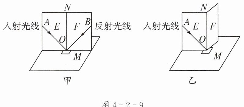 (2)如图4-2-9乙所示,把纸板F向前或向后折,则在纸板F上____(选填“能”或“不能”)看到反射光线,说明反射光线、入射光线和法线在____。