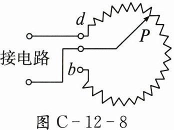 10. (6分)收音机中用来调节音量大小的电位器实际相当于______。其原理如图C-12-8所示,若要使音量增大,滑动头P应向______(选填“b”或“d”)端转动,此时电路中的电流______(选填“增大”或“减小”)。