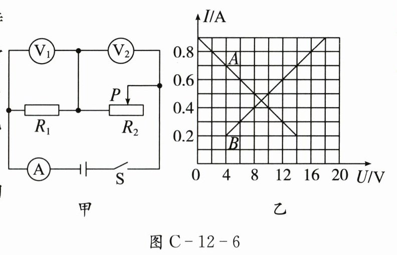 8. 如图C-12-6甲所示,电源电压保持不变。闭合开关S,当滑动变阻器的滑动头P从最右端移到最左端的过程中,$R_1$、$R_2的I-U$图像如图C-12-6乙所示。下列判断正确的是( )。