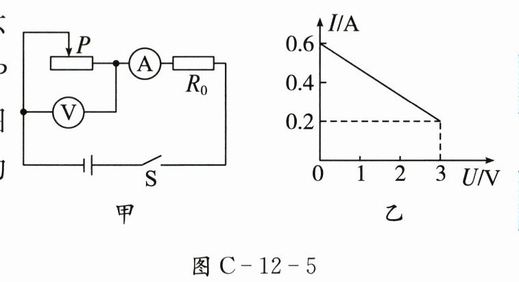 7. 如图C-12-5甲所示,电源电压保持不变。闭合开关S,将滑动变阻器的滑动头P从最左端移至最右端,记录电表的示数,图C-12-5乙是电流表示数与电压表示数的关系图像。下列说法正确的是( )。