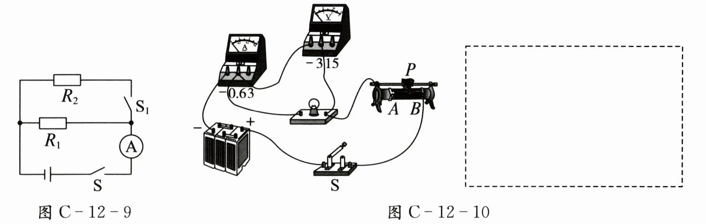 12. (4分)如图C-12-9所示,电源电压保持不变,定值电阻$R_1 = 10Ω$。只闭合开关S时,电流表的示数为0.3A;同时闭合开关S、$S_1$时,电流表的示数为0.4A,则电源电压为______V,定值电阻$R_2$的阻值为______Ω。