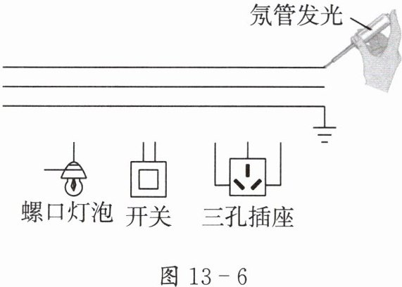 图 13 - 6:有三条平行导线,最上边导线试电笔测试氖管发光(火线),中间零线,下边地线。元件:螺口灯泡、开关、三孔插座。