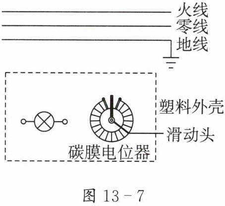 图 13 - 7:有三条平行导线,上边火线,中间零线,下边地线。塑料外壳内有灯泡、碳膜电位器(有滑动头)。
