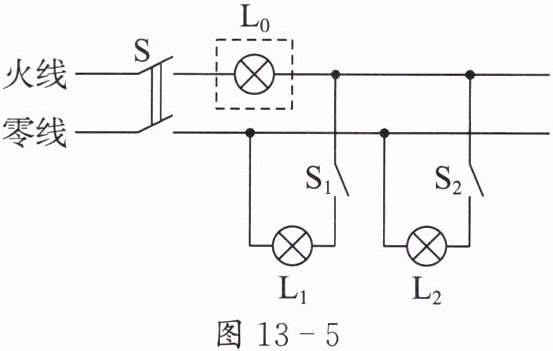 图 13 - 5:电路图,有火线、零线、开关 S、检验灯泡 L₀(虚线框)、灯泡 L_1、L_2、开关 S_1、S_2。L₀ 接在火线和零线之间,L_1 支路:S_1 控制 L_1,L_1 一端接零线,一端接 S_1,S_1 另一端接 L₀ 右端。L_2 支路:S_2 控制 L_2,L_2 一端接零线,一端接 S_2,S_2 另一端接 L₀ 右端。