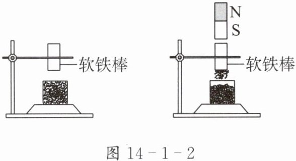5. 如图 14-1-2 所示,把条形磁体的一端靠近一根原来没有磁性的铁棒,铁棒吸起了下面的铁屑,这种使原来没有磁性的物质获得______的过程叫作______。