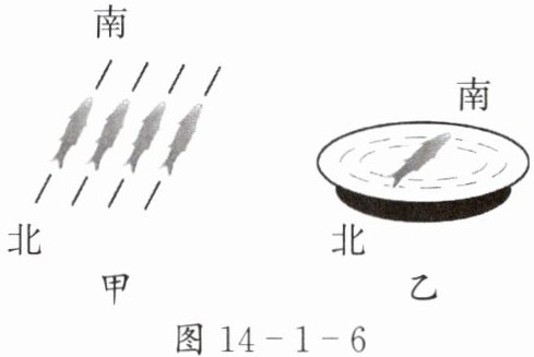 4. 我国古代劳动人民很早就会运用磁化技术。据《武经总要》记载,古人先将鱼形铁烧红,令铁鱼头尾指向南北,如图 14-1-6 甲所示,然后将其放入水中冷却,依靠地磁场获得磁性,再将其放入水中使其漂浮,制成指南鱼,它静止时鱼头指南,如图 14-1-6 乙所示。下列判断不正确的是( )。