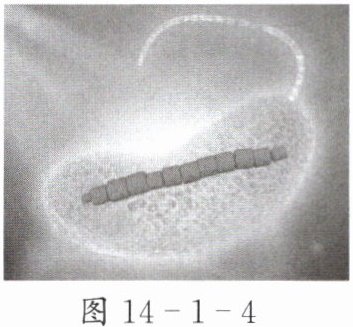 2. 如图 14-1-4 所示,趋磁细菌体内可以合成纳米级、链状排列的磁小体,可用于生产磁性定向药物或抗体、制造生物传感器等。若将磁体置于细菌附近,则细菌向磁体的 N 极运动。由此可见,在海洋中,地磁场将驱使这种细菌运动的方向为( )。