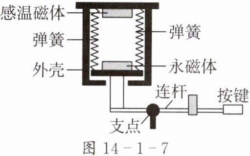 电饭锅是日常生活中常见的用电器,它利用磁体限温器来控制煮饭过程中的最高温度。磁体限温器的结构如图 14-1-7 所示,它由永磁体、感温磁体和弹簧等组成,感温磁体及其外壳由弹簧支撑。永磁体的磁性不变,感温磁体的磁性会随温度的升高而减弱,当温度达到 103℃时,感温磁体失去磁性。