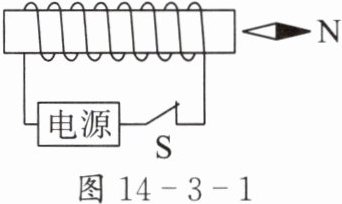 1. 小礼在做“探究通电螺线管外部磁场的方向”实验。闭合开关,可自由转动的小磁针静止时 N 极的指向如图 14 - 3 - 1 所示。下列说法正确的是( )。