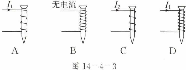 2. 小明在学习了电磁铁的知识后,自己动手用铁钉、电池和导线制作了几个电磁铁,如图 14 - 4 - 3 所示,已知 $ I_1 > I_2 $,则磁性最强的是( )。