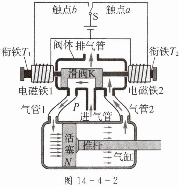 公共汽车利用压缩空气开关控制车门的过程利用了电磁阀。如图 14 - 4 - 2 所示,这是公共汽车开门的工作原理图。那么当司机要关闭车门时,将开关 S 接通______,左侧电磁铁 1 通电,衔铁______被吸入线圈中,则横杆将阀体中的滑阀 K 推到______端,储气筒 P 中的压缩空气就通过气管 2 进入气缸右部,推动活塞 N 向______运动,使车门关闭。