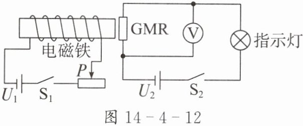 法国科学家阿尔贝·费尔和德国科学家彼得·格林贝格尔由于研究巨磁阻效应而荣获诺贝尔物理学奖。巨磁阻效应是指某些材料的电阻在磁场作用下发生巨大变化的现象,这一发现大大提高了磁、电之间信号转换的灵敏度。如图 14 - 4 - 12 所示,电源电压保持不变,GMR 是巨磁阻,其阻值随着磁场的增强而显著减小。
