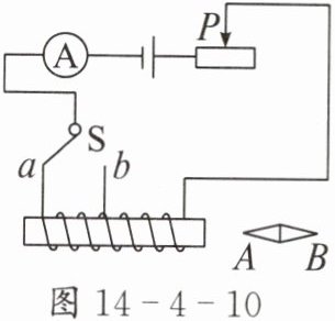 4. 如图 14 - 4 - 10 所示,可自由转动的小磁针静止时,A 端是______(选填“N”或“S”)极。将开关 S 由 a 换到 b,调节滑动变阻器的滑动头 P,保持电流表的示数不变,电磁铁的磁性______(选填“增强”“减弱”或“不变”)。