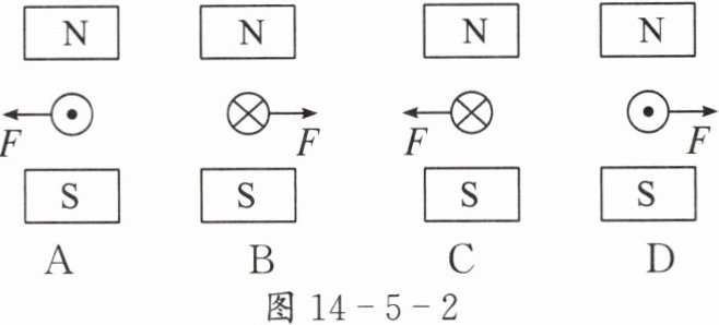 2. (多选)“⊙”表示通电导线中的电流方向垂直于纸面向外,“⊗”表示通电导线中的电流方向垂直于纸面向里。请根据图 14 - 5 - 1 中通电导线的受力情况判断图 14 - 5 - 2 中通电导线的受力情况错误的是( )。