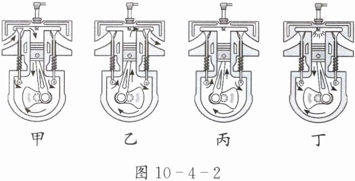 3. 图 10 - 4 - 2 是汽油机工作时的四个冲程,下列说法正确的是( )。