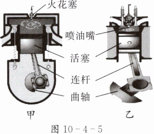 5. 汽油机与柴油机的示意图如图 10 - 4 - 5 所示,则____(选填“甲”或“乙”)是柴油机的示意图。在汽油机的压缩冲程中,活塞向上运动,压缩燃料混合物做功,燃料混合物的温度____(选填“升高”或“降低”),内能____(选填“增加”或“减少”)。